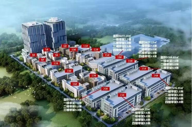 其中,标准厂房建筑面积1600-7500平方米不等,超高举架和超宽柱跨为入驻企业提供极致宽敞空间,可满足产品研发、产品中试、加工制造和总部办公等所有需求,帮助企业实现集产、办、研于一体的“一站式”发展。